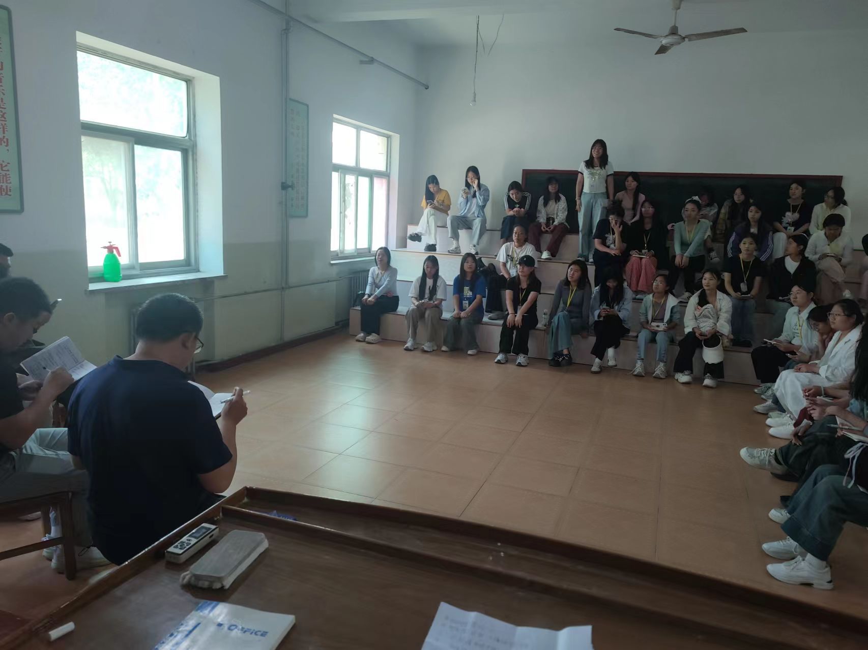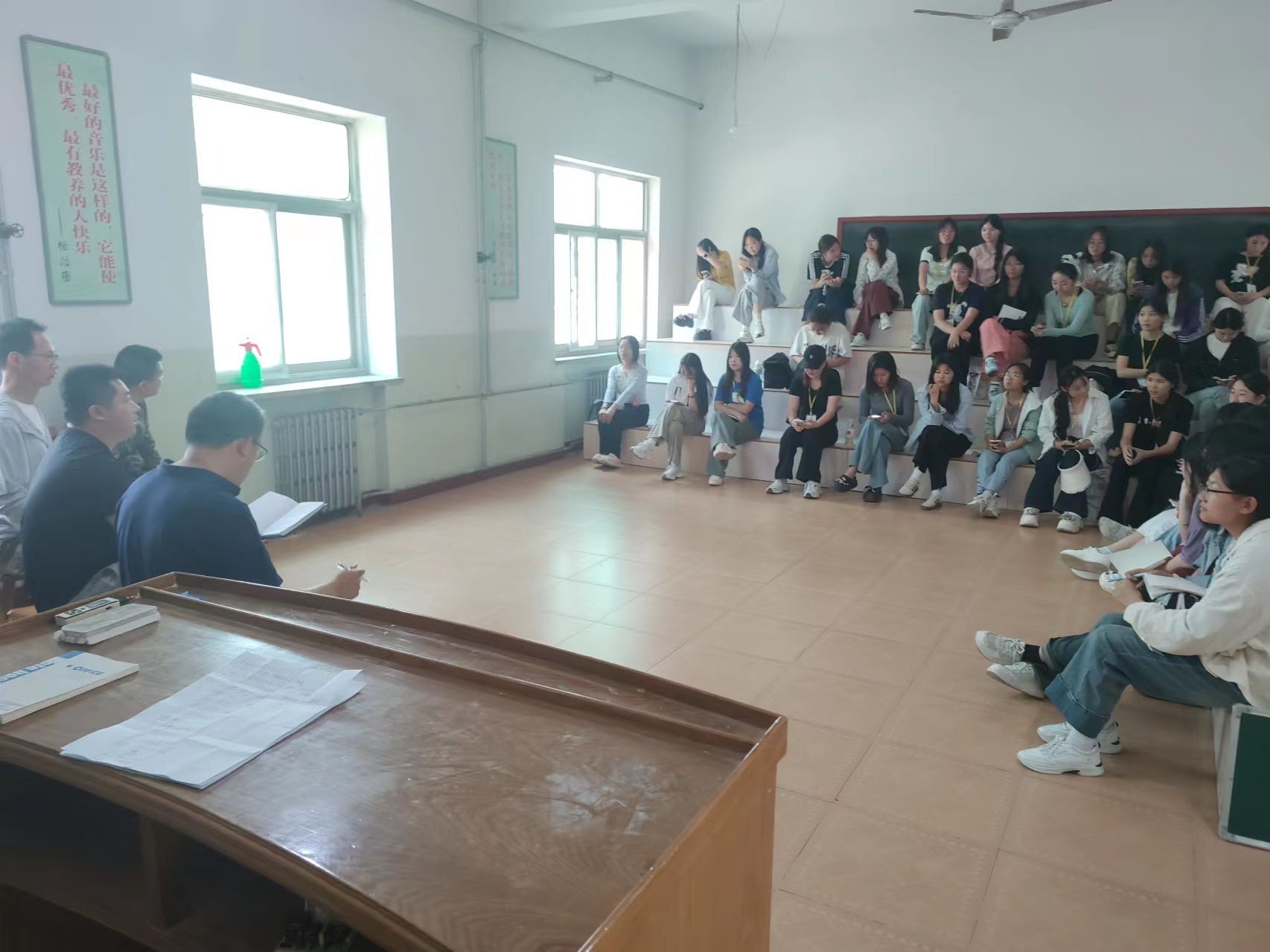 2025年5月26日下去4:30分,实训中心在尚艺楼一楼声乐实训室召开了学生座谈会。参加本次会议的教师有实训中心办公室陈环老师、尚行楼负责人杜锋老师、尚艺楼负责人范海超老师,图书馆管理员殷檬檬老师,教学设备管理办公室谢建新老师,以及23、24级各班学习委员。